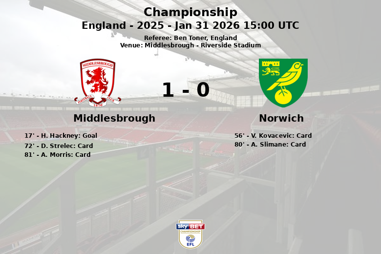 Middlesbrough, Angleterre – Lors d’un match de Championship comptant pour la 30e journée de la saison 2025, Middlesbrough a réussi à battre Norwich au Riverside Stadium. L’unique but du match, marqué par H. Hackney à la 17e minute sur une passe décisive de R. McGree, a scellé le score final.