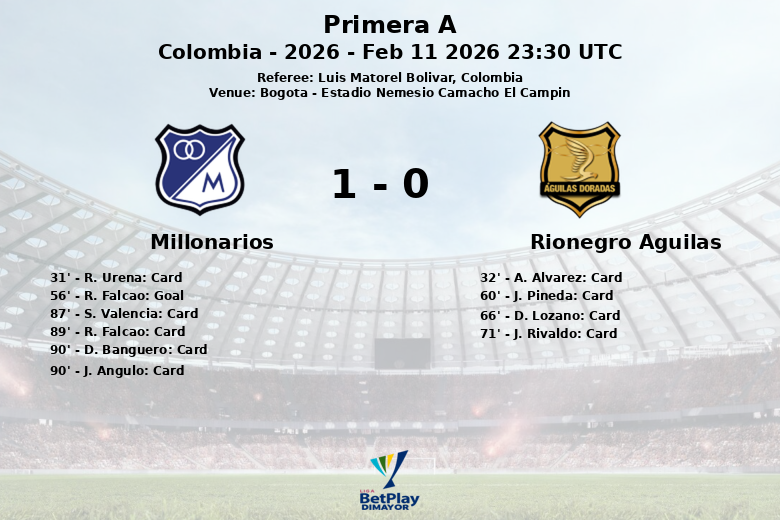Bogotá, Colombie – Dans un match rempli de tension et de cartons, Millonarios a battu Rionegro Águilas grâce à un unique but de Radamel Falcao sur penalty à la 56e minute. Le match, disputé à l’Estadio Nemesio Camacho El Campín, correspondant à la sixième journée de Primera A, saison 2026, a été arbitré par Luis Matorel Bolivar.