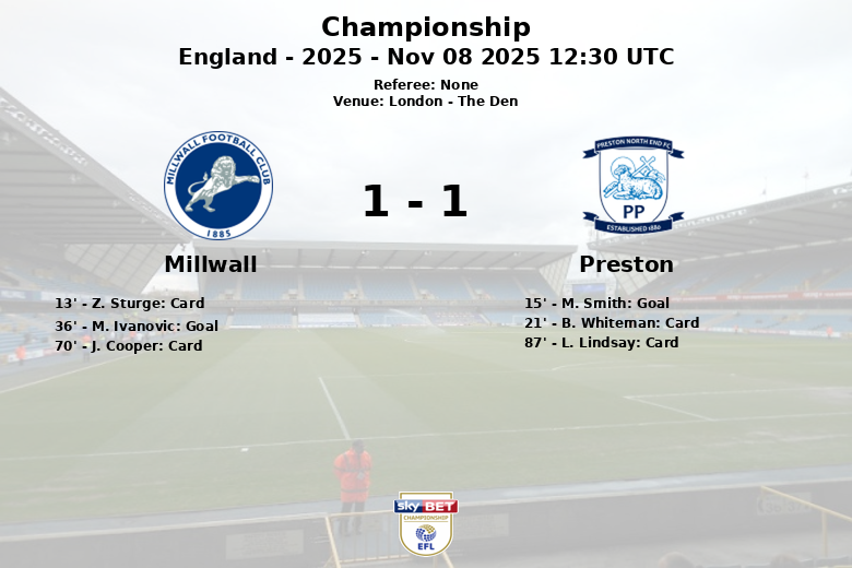 Preston a pris l’avantage dès la 15e minute grâce à un but de M. Smith, sans assistance. Cependant, Millwall a réagi en première mi-temps avec un but de M. Ivanovic à la 36e minute, rétablissant l’égalité avant la pause.