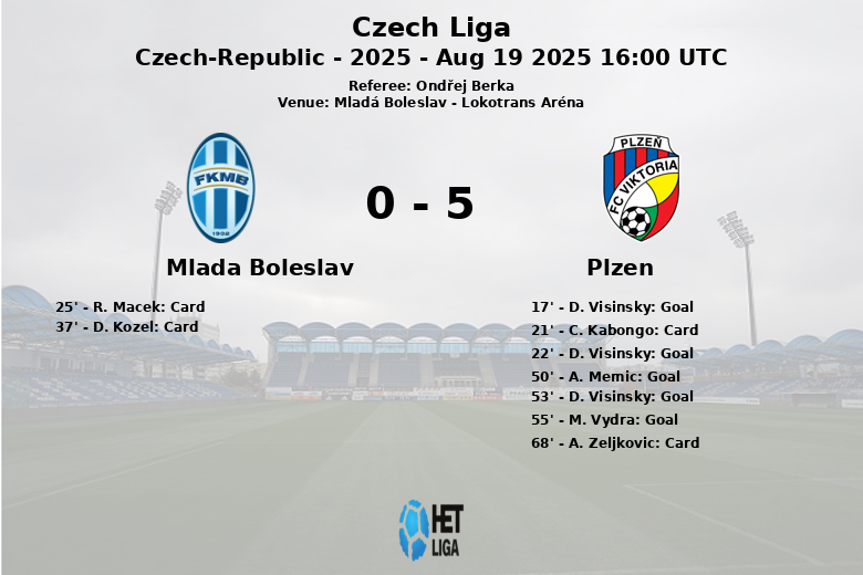 En deuxième mi-temps, Plzen a continué à creuser l’écart. A. Memic, qui avait déjà été passeur décisif sur deux buts, s’est joint à la fête en marquant à la 50e minute, sur une passe de T. Ladra. Peu de temps après, à la 53e minute, D. Visinsky a réalisé son coup du chapeau, sur une passe de C. Souare. Le cinquième but de Plzen est arrivé à la 55e minute, œuvre de M. Vydra, sur une nouvelle passe de A. Memic, confirmant la domination de Plzen. Le match était arbitré par Ondřej Berka. Mlada Boleslav a lutté pour réduire l’écart, mais son unique tir cadré n’a pas suffi à inquiéter Plzen, qui a remporté une victoire méritée à la Lokotrans Aréna. Le nombre élevé de fautes commises par Plzen (17) n’a pas empêché sa victoire nette.