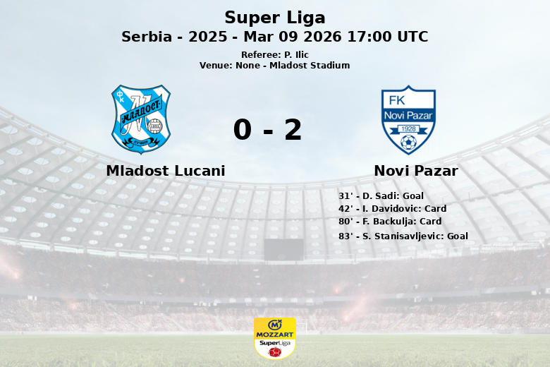Novi Pazar s’est imposé face à Mladost Lucani lors d’un match disputé au Mladost Stadium. Malgré une possession de balle dominante de Mladost Lucani à 56%, Novi Pazar s’est avéré plus efficace devant le but. Le premier but du match est survenu à la 31e minute, marqué par D. Sadi pour Novi Pazar. Mladost Lucani a tenté de réagir, créant des occasions, mais sans parvenir à les concrétiser. La défense de Novi Pazar s’est montrée solide et organisée. À la 42e minute, I. Davidovic de Novi Pazar a reçu un carton jaune. L’intensité du jeu est restée élevée en seconde période, Mladost Lucani cherchant l’égalisation et Novi Pazar défendant son avance. F. Backulja de Novi Pazar a également été averti d’un carton jaune à la 80e minute. Finalement, à la 83e minute, S. Stanisavljevic a scellé le match avec le deuxième but pour Novi Pazar. Le match s’est terminé par une victoire pour Novi Pazar, qui remporte trois points importants en Super Liga serbe. Mladost Lucani a eu 7 corners pendant le match, tandis que Novi Pazar n’en a eu aucun. Novi Pazar a commis beaucoup plus de fautes que Mladost Lucani, 15 contre 3. Le score final était Mladost Lucani zéro – Novi Pazar deux.