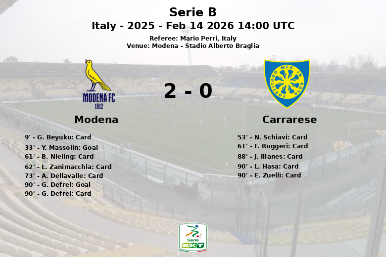Modena, le 14 février 2026 – Dans un match disputé au Stadio Alberto Braglia, Modena a remporté une victoire sur Carrarese dans un match caractérisé par un nombre élevé de cartons jaunes et une bataille acharnée au milieu de terrain.