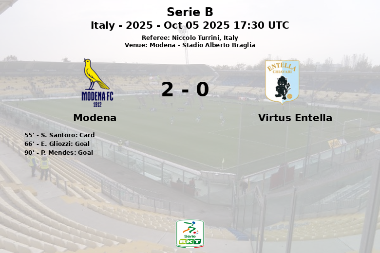 Modena, Italie – Dans un match disputé au Stadio Alberto Braglia, Modena a vaincu Virtus Entella avec un score de deux buts à zéro. Le match, comptant pour la septième journée de la Serie B, a été arbitré par Niccolo Turrini.
