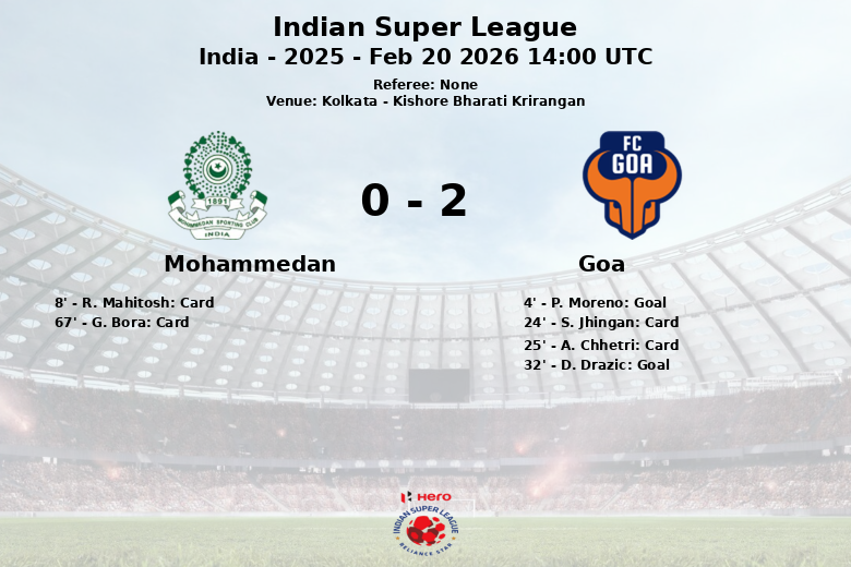 Remplacements dans l’quipe de goa: À la 66e minute, M. Nemil est entré et A. Rabeeh A K est sorti., À la 79e minute, A. Chhetri est entré et D. Lalhlimpuia est sorti., À la 88e minute, B. Fernandes est entré et R. Fernandes est sorti., À la 88e minute, S. Tavora est entré et M. Yasir est sorti.