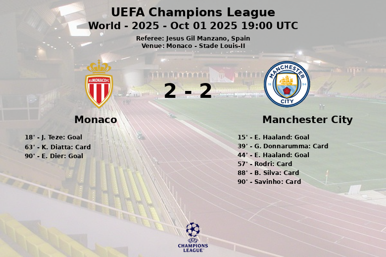 Monaco, 1er octobre 2025 – Le Stade Louis-II a été le théâtre d’une rencontre palpitante entre Monaco et Manchester City, qui s’est soldée par un match nul laissant la qualification en suspens. Erling Haaland a brillé pour City avec un doublé (minutes 15 et 44), mais Monaco a répondu avec des buts de J. Teze (minute 18) et E. Dier, ce dernier sur penalty dans la dernière minute du match (minute 90).