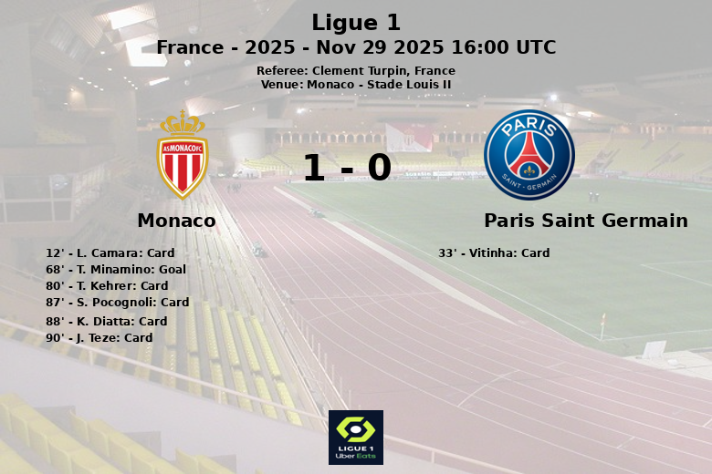 L’AS Monaco a remporté une victoire importante à domicile contre le Paris Saint Germain dans un match disputé au Stade Louis II. Malgré une possession de balle inférieure (45% contre 55% pour le PSG), Monaco s’est montré plus efficace devant le but. Le seul but du match a été marqué à la 68e minute par T. Minamino, sur une passe décisive de A. Golovin.