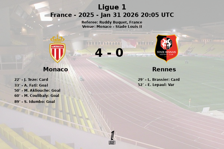 Monaco a ouvert le score à la 33e minute grâce à un but d’A. Fati, servi par F. Balogun. L’avantage a été étendu en début de seconde période, à la 50e minute, avec un but de M. Akliouche, servi par A. Golovin. Rennes a tenté de réagir, mais un but d’E. Lepaul a été refusé par la VAR pour cause de hors-jeu à la 52e minute. Monaco a continué à presser et M. Coulibaly a marqué le troisième but à la 60e minute, sur une passe de M. Biereth. Dans les dernières minutes, à la 89e minute, S. Idumbo a scellé la victoire avec un quatrième but, à nouveau servi par M. Biereth.