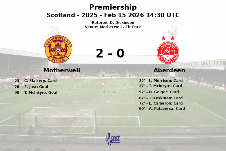Le match a commencé par un carton jaune pour C. Slattery de Motherwell à la 23e minute. Cinq minutes plus tard, E. Just a ouvert le score pour Motherwell avec un but suite à une passe décisive de S. Welsh. La première mi-temps s’est poursuivie à un rythme élevé avec plusieurs avertissements pour Aberdeen.