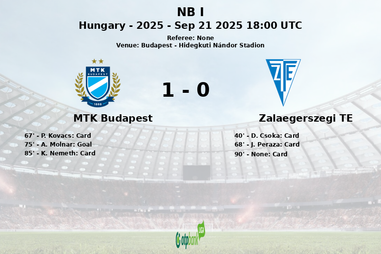 Budapest – Lors d’un match comptant pour la septième journée de la NB I, le MTK Budapest a remporté une victoire étroite contre Zalaegerszegi TE au Hidegkuti Nándor Stadion. Le match, disputé à Budapest, a été marqué par une possession de balle favorable au MTK Budapest, qui a contrôlé le ballon pendant 58 % du temps, contre 42 % pour Zalaegerszegi TE.