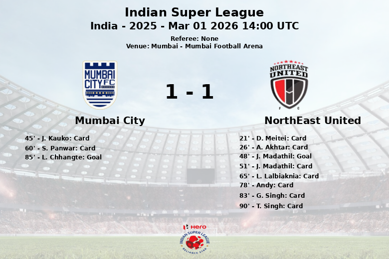 NorthEast United a pris l’avantage à la 48e minute grâce à un but de J. Madathil, sur une passe de L. Lalbiaknia. Cependant, Mumbai City, qui a dominé la possession avec 61%, a réussi à égaliser à la 85e minute grâce à un but de L. Chhangte.