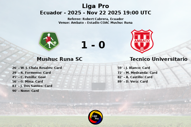 La rencontre, arbitrée par Robert Cabrera, s’est déroulée dans une atmosphère tendue, comme en témoignent les nombreuses fautes commises par les deux équipes, 10 par Mushuc Runa SC et 13 par Técnico Universitario. Malgré les efforts de Técnico Universitario, les huit corners en leur faveur n’ont pas suffi à inverser le score.