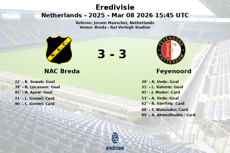 Le match a également été marqué par l’intensité du jeu, reflétée par les cartons distribués. J. Moder, R. Sterling, T. Watanabe et A. Ahmedhodzic ont reçu un carton jaune pour Feyenoord, tandis que L. Greiml a reçu un carton jaune puis un carton rouge pour NAC Breda à la 90e minute. Feyenoord a dominé la possession avec 57%, tandis que NAC Breda en avait 43%. Feyenoord a généré 14 tirs dont 5 cadrés, tandis que NAC Breda a généré 11 tirs dont 4 cadrés.