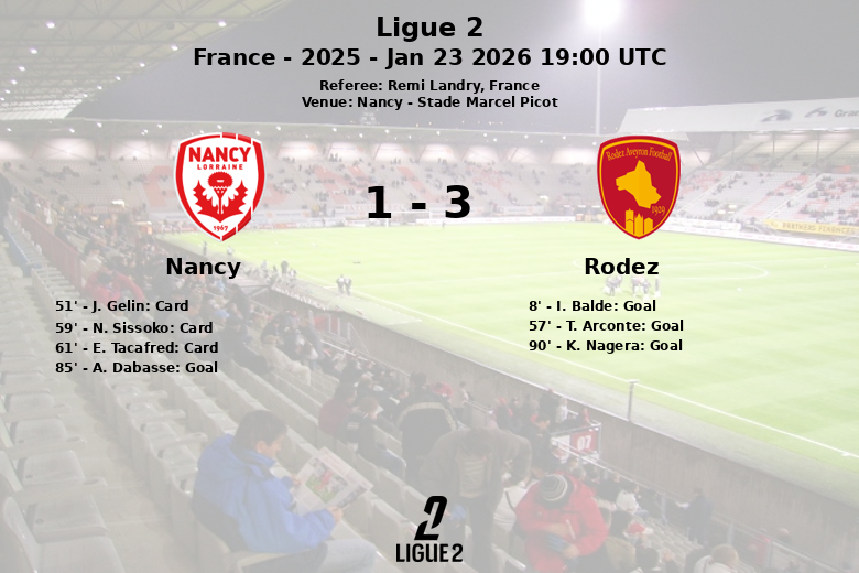 Le match a commencé avec un but rapide de Rodez à la 8e minute, gracieuseté de I. Balde, passe décisive de T. Arconte. Nancy a cherché à réagir, mais la défense de Rodez est restée solide. La deuxième mi-temps a vu Rodez creuser l’écart à la 57e minute avec un but de T. Arconte, sur une passe de M. Saka. Nancy a désespérément tenté de réduire l’écart et a réussi à la 85e minute avec un but de A. Dabasse, sur une passe de P. Ouotro. Cependant, tout espoir de match nul a disparu lorsque K. Nagera a marqué le troisième but de Rodez à la 90e minute, scellant le match.
