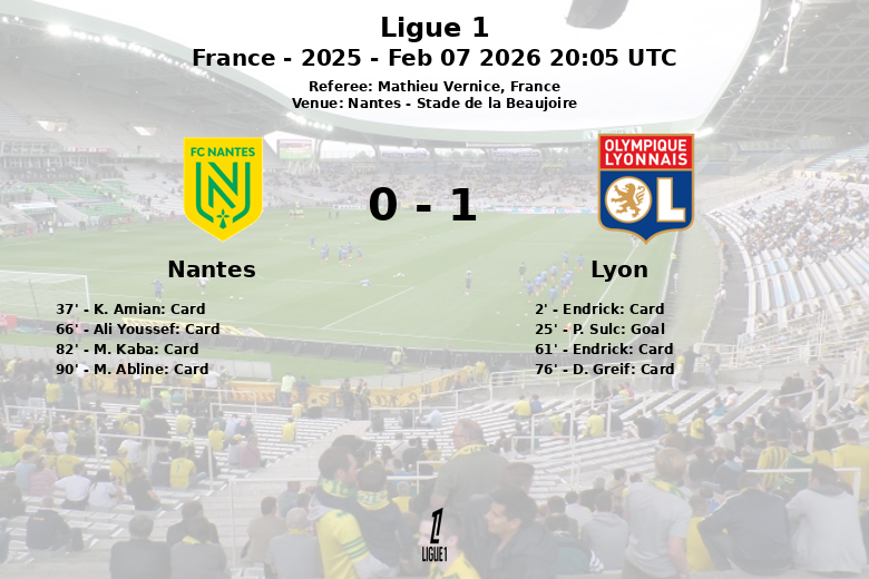 Nantes, France – Dans un match chargé de tension et d’émotions, Lyon a battu Nantes dans son propre stade, le Stade de la Beaujoire. Le match, correspondant à la 21e journée de Ligue 1, a été marqué par un jeu intense et la discipline, reflétée dans le nombre de cartons distribués par l’arbitre Mathieu Vernice.