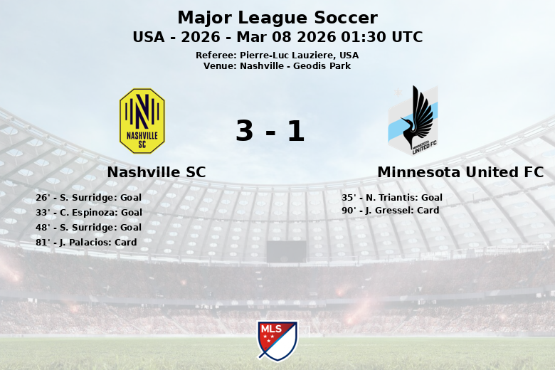 Le match a été caractérisé par un rythme effréné. S. Surridge a ouvert le score pour Nashville à la 26e minute, suivi par C. Espinoza à la 33e. Minnesota United a réagi rapidement avec un but de N. Triantis à la 35e minute, réduisant l’écart. Cependant, la joie fut de courte durée pour les visiteurs, car S. Surridge a marqué à nouveau pour Nashville à la 48e minute, augmentant l’avance et scellant la victoire pour son équipe.
