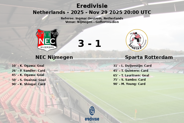 De son côté, le Sparta Rotterdam, bien qu’avec 48% de la possession et 13 tirs (5 cadrés), n’a pas réussi à concrétiser ses occasions. T. Lauritsen a réduit l’écart à la 65e minute, assisté par J. Kitolano, mais cela n’a pas suffi à changer le cours du match. La rencontre a été marquée par un jeu intense, reflété par les cartons jaunes montrés à P. Sandler et K. Shiogai pour le NEC, et à L. Duijvestijn, T. Quintero et S. Sambo pour le Sparta Rotterdam. De plus M. Young de Sparta Rotterdam verrait un carton jaune à la 90e minute. Le NEC Nijmegen a fait preuve de solidité et d’efficacité face à un Sparta Rotterdam qui s’est battu mais n’a pas réussi à égaler le niveau de jeu de son rival.