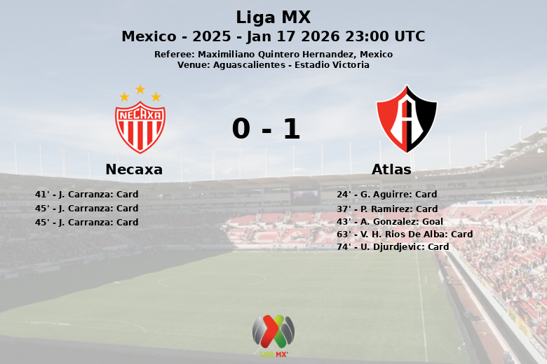 Aguascalientes, Mexique – Dans un match acharné à l’Estadio Victoria, Atlas a remporté la victoire contre Necaxa dans un match marqué par l’intensité et la discipline. Un but solitaire de A. Gonzalez à la 43e minute, assisté par G. Aguirre, a suffi pour assurer la victoire de l’équipe visiteuse. Le match a été tendu, comme en témoignent les nombreux avertissements et expulsions. Pour Atlas, G. Aguirre, V. H. Rios De Alba et U. Djurdjevic ont reçu des cartons jaunes, tandis que P. Ramirez a été expulsé à la 37e minute. Necaxa, de son côté, a subi l’expulsion de J. Carranza à la 45e minute, après avoir reçu deux cartons jaunes. Malgré une possession de balle de 60 %, Necaxa n’a pas réussi à concrétiser ses occasions, enregistrant 12 tirs, dont seulement 2 cadrés. Atlas, avec 40 % de possession, s’est avéré plus efficace, avec 13 tirs, dont 3 cadrés. L’arbitre Maximiliano Quintero Hernandez a eu une soirée chargée, sifflant 10 fautes pour Necaxa et 13 pour Atlas.