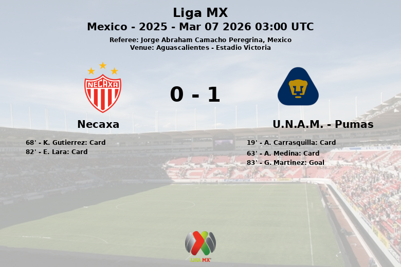 Remplacements dans l’quipe de u.n.a.m. – pumas: À la 67e minute, Juninho est entré et U. Antuna est sorti., À la 78e minute, J. Carrillo est entré et G. Martinez est sorti., À la 89e minute, A. Medina est entré et P. Bennevendo est sorti., À la 89e minute, R. Morales est entré et C. Garza est sorti.