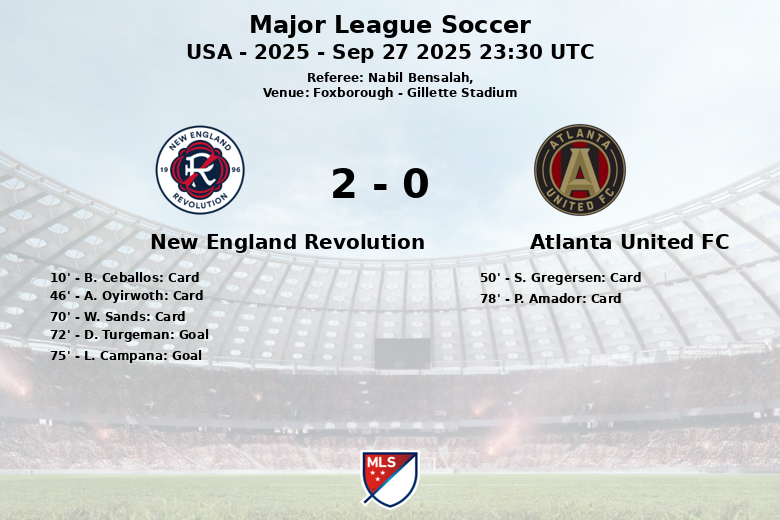 Le match, ponctué par un rythme élevé et plusieurs cartons jaunes – trois pour l’équipe locale et deux pour les visiteurs – a vu le New England Revolution prendre l’avantage à la 72e minute grâce à un but de D. Turgeman, assisté par C. Gil. Cependant, la joie des locaux fut de courte durée, car L. Campana a égalisé pour Atlanta United FC à peine trois minutes plus tard, à la 75e minute.