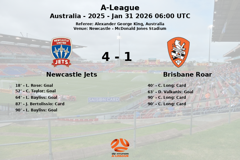 Newcastle, Australie – Dans un match palpitant qui s’est déroulé au McDonald Jones Stadium, les Newcastle Jets ont battu Brisbane Roar lors d’un affrontement de la A-League qui a tenu les supporters en haleine. Le match, arbitré par Alexander George King, a été un festival de buts rempli d’émotions, bien que marqué par la discipline.