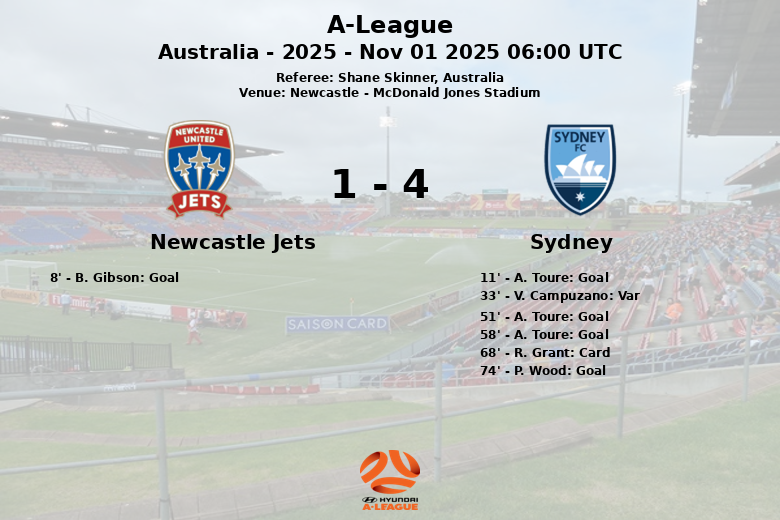 Newcastle, Australie – Lors d’un match disputé au McDonald Jones Stadium, Sydney FC a battu Newcastle Jets lors d’un match de A-League marqué par plusieurs buts et une décision VAR controversée. Les Jets, avec une possession de balle de 59%, ont ouvert le score rapidement grâce à B. Gibson à la 8e minute, servi par D. Wilmering. Cependant, Sydney a rapidement réagi, avec A. Toure égalisant le score à la 11e minute.