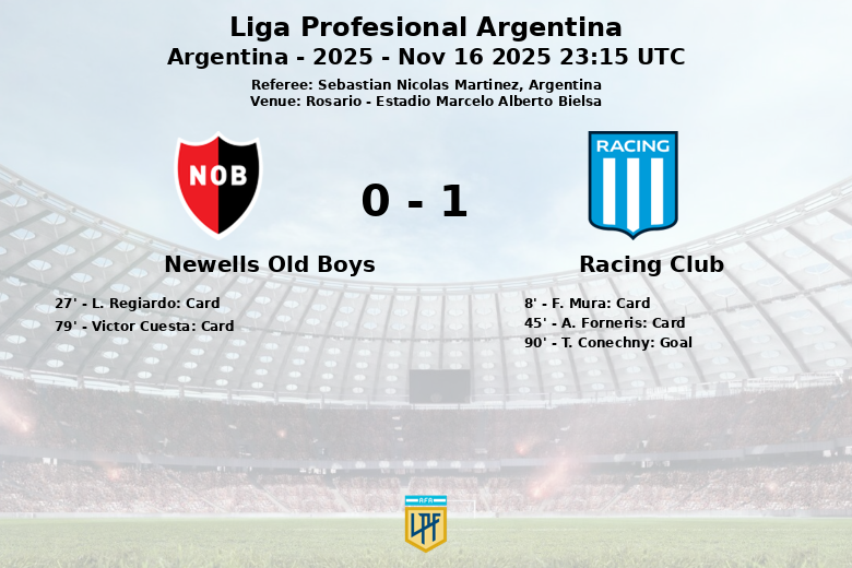 Rosario, Argentine – Dans un match acharné au Estadio Marcelo Alberto Bielsa, Racing Club a battu de justesse Newells Old Boys grâce à un but dans la dernière minute de T. Conechny. Le match, correspondant à la 16e journée de la Liga Profesional Argentina, a été caractérisé par une forte possession de balle du Racing Club (70%), bien que les occasions de marquer aient été relativement rares. Newells Old Boys, avec 30% de possession, a cherché à surprendre en contre-attaque, mais n’a réussi qu’un seul tir cadré sur six tentatives. L’arbitre, Sebastian Nicolas Martinez, a distribué plusieurs cartons jaunes, deux pour chaque équipe, reflétant l’intensité du jeu. Racing Club a généré plus de danger en attaque, avec quatre tirs cadrés sur sept tentatives, et a obtenu plus de corners (5) que son adversaire (2). Finalement, le but de Conechny à la 90e minute a assuré la victoire du Racing Club, laissant Newells Old Boys les mains vides dans son propre stade.