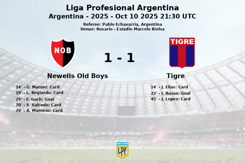 Rosario, Argentine – Dans un match disputé au Stade Marcelo Bielsa, Newell’s Old Boys et Tigre ont fait match nul dans une rencontre pleine d’intensité et de cartons. Newell’s a dominé la possession avec 53 %, mais Tigre s’est montré dangereux en attaque. Le match a commencé avec un but rapide d’Ignacio Russo pour Tigre à la 22e minute, sur une passe décisive de D. Romero. Cependant, la joie fut de courte durée, car F. Guch a égalisé pour Newell’s à la 29e minute avec une passe de L. Herrera. Malgré le match nul, le match a été très disputé au milieu de terrain, comme en témoignent les nombreuses fautes commises par les deux équipes (12 pour Newell’s et 16 pour Tigre) et les six cartons jaunes sortis par l’arbitre Pablo Echavarria (quatre pour Newell’s et deux pour Tigre). Newell’s a eu un plus grand nombre de tirs (16 au total, dont 5 cadrés), tandis que Tigre a réalisé 14 tirs (3 cadrés). Finalement, le score est resté inchangé et le match s’est terminé par un match nul vibrant.