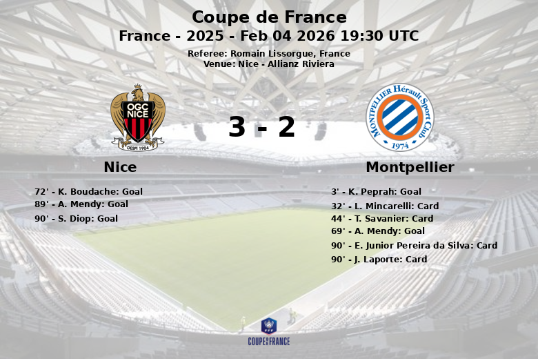 Nice, France – L’Allianz Riviera a été le théâtre d’un match vibrant de la Coupe de France, où Nice a triomphé de Montpellier dans une rencontre pleine d’émotions et de buts. Le match, disputé le 4 février 2026, a été marqué par une forte possession de balle pour Nice (65 %) et un jeu offensif constant, reflété dans leurs 21 tirs, bien que seulement 4 d’entre eux aient trouvé le cadre.