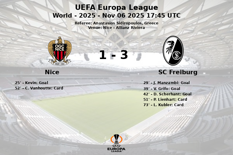 Nice a ouvert le score à la 25e minute grâce à un but de Kevin, assisté par C. Vanhoutte, donnant de l’espoir aux supporters locaux. Cependant, Fribourg a rapidement répondu. J. Manzambi a égalisé le match à la 29e minute avec un but assisté par Y. Suzuki. Fribourg a pris l’avantage grâce à un penalty transformé par V. Grifo à la 39e minute, et a étendu son avantage à la 42e minute avec un but de D. Scherhant, assisté par M. Ginter.