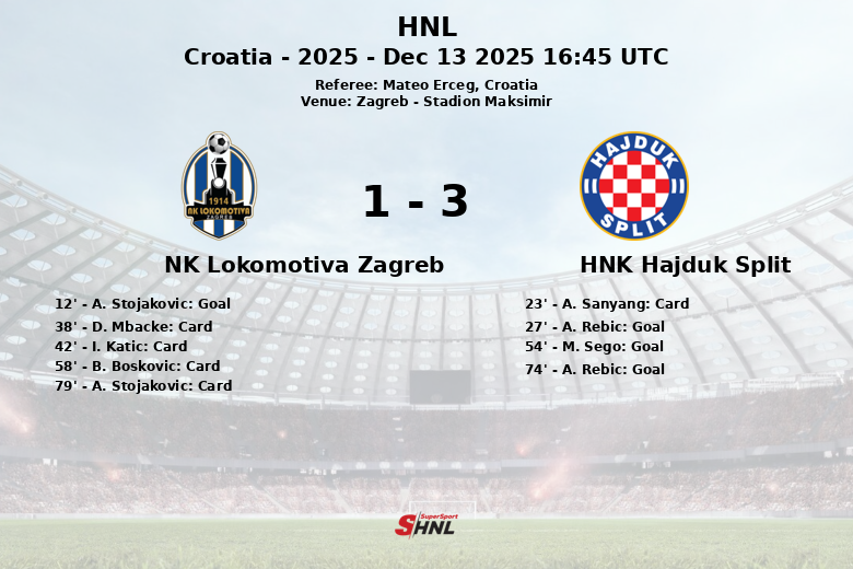 Zagreb, le 13 décembre 2025 – Hajduk Split a battu le NK Lokomotiva Zagreb dans un match acharné au Stadion Maksimir, dans le cadre de la 17e journée de HNL. Le match, arbitré par Mateo Erceg, a été intense et a offert des occasions aux deux équipes, bien que l’efficacité de Hajduk ait finalement fait pencher la balance en leur faveur.