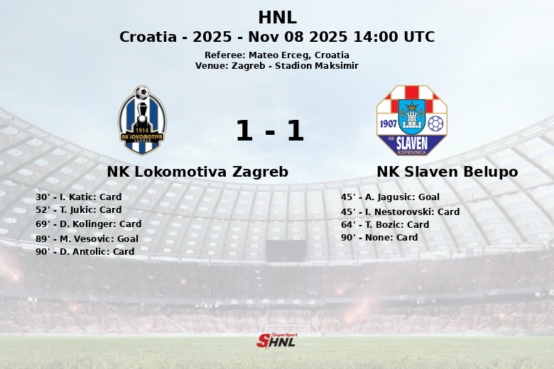 Dans un match disputé au Stadion Maksimir de Zagreb, le NK Lokomotiva Zagreb et le NK Slaven Belupo ont fait match nul dans une rencontre qui a tenu les supporters en haleine jusqu’à la dernière minute. Le match, comptant pour la 13e journée de la saison 2025 de HNL, a été marqué par une forte intensité et de nombreux cartons jaunes, reflétant la lutte pour chaque ballon.