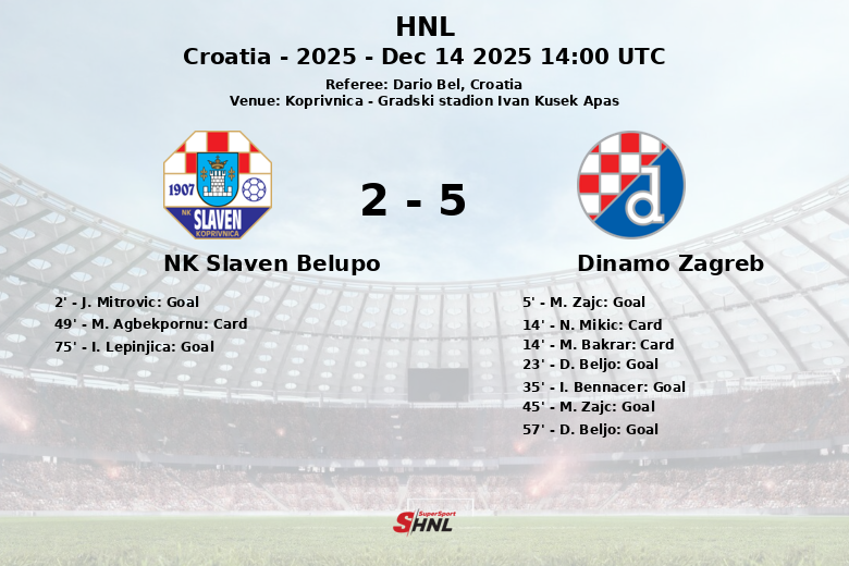 En seconde période, D. Beljo a de nouveau marqué à la 57e minute, assisté par A. Hoxha. Le NK Slaven Belupo a tenté de réagir et a réussi à réduire l’écart à la 75e minute avec un but de I. Lepinjica, mais cela n’a pas suffi à inquiéter le Dinamo.