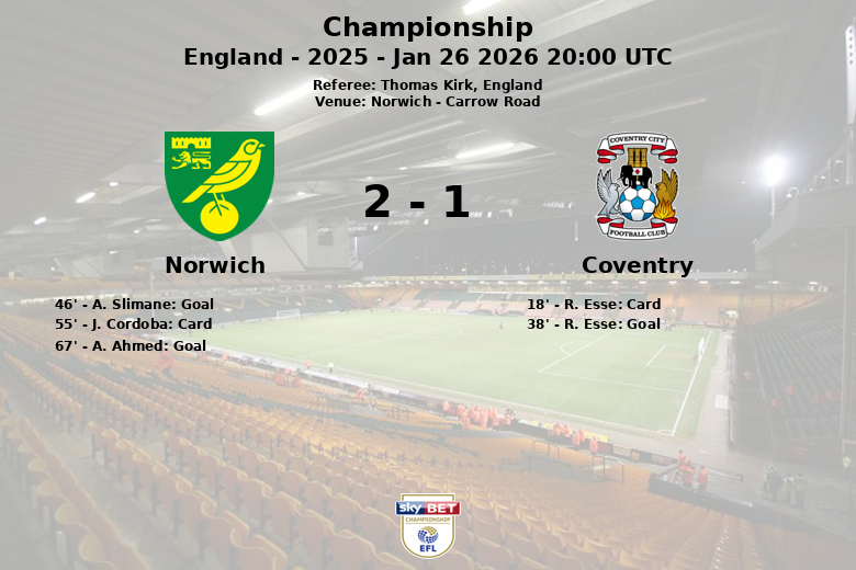 Coventry a pris l’avantage grâce à un but de R. Esse à la 38e minute, après une première mi-temps où le jeu était équilibré. Cependant, Norwich a réagi en seconde période. A. Slimane a égalisé à la 46e minute, puis Ahmed a donné l’avantage à l’équipe locale à la 67e minute.
