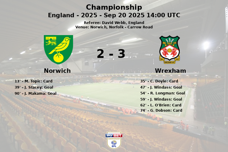 Le match a commencé avec un carton jaune pour M. Topic de Norwich à la 13e minute. Norwich a pris l’avantage à la 39e minute grâce à un but de J. Stacey, assisté par M. Jurasek. Cependant, Wrexham est revenu de la mi-temps avec une énergie renouvelée. J. Windass a égalisé à la 47e minute, assisté par I. Kabore. La remontée de Wrexham s’est poursuivie avec un but de R. Longman à la 54e minute, à nouveau assisté par I. Kabore, et un deuxième but de J. Windass à la 59e minute, cette fois assisté par M. Cleworth.