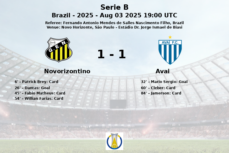 Novorizontino a dominé la possession du ballon avec 60%, générant un plus grand nombre d’occasions de but, avec 18 tirs au total dont 7 cadrés. Dantas a ouvert le score pour l’équipe locale à la 26e minute. Cependant, Avaí a répondu à la 32e minute avec un but de Mario Sergio, égalisant le score.