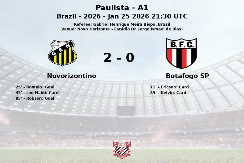 Romulo a ouvert le score pour l’équipe locale à la 25e minute, en transformant un penalty. Malgré la domination de Botafogo SP en termes de possession de balle (65 %), Novorizontino s’est montré solide en défense et dangereux en contre-attaque. La première mi-temps s’est terminée par un carton jaune pour Leo Naldi de Novorizontino.