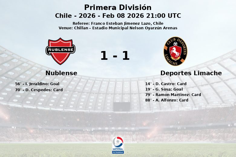 Deportes Limache a pris l’avantage à la 19e minute, grâce à un but de G. Sosa. Cependant, Ñublense a réussi à égaliser à la 56e minute avec un but de I. Jeraldino.