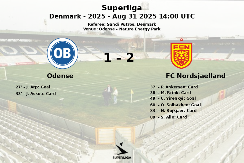 Odense a pris l’avantage à la 27e minute grâce à un but de J. Arp, après une action sans passe décisive apparente. Cependant, la joie locale fut de courte durée. Le FC Nordsjaelland a réagi en seconde période. C. Yirenkyi a égalisé à la 49e minute, également sans passe décisive. Peu de temps après, à la 60e minute, O. Solbakken a marqué le but qui allait donner la victoire à l’équipe visiteuse.