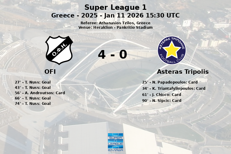 La deuxième mi-temps s’est avérée encore plus difficile pour Asteras Tripolis. J. Chicco a reçu un carton rouge à la 61e minute, laissant son équipe à dix hommes. L’OFI a profité de l’avantage numérique, et T. Nuss a de nouveau marqué à la 66e minute, à nouveau avec une passe décisive de B. Gonzalez. Nuss a scellé sa performance exceptionnelle avec un quatrième but à la 74e minute, cette fois grâce à une passe décisive de N. Christogeorgos. Asteras Tripolis a également reçu un carton jaune pour N. Sipcic à la 90e minute.