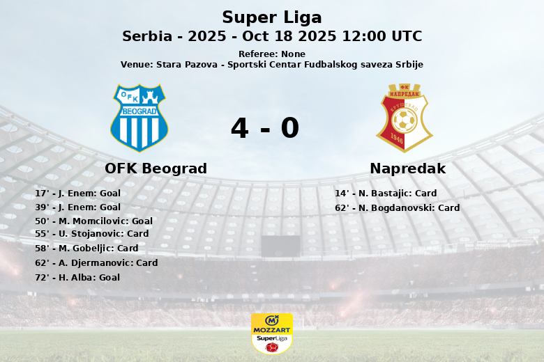 Stara Pazova, Serbie – Dans un match qui s’est déroulé au Sportski Centar Fudbalskog saveza Srbije, l’OFK Beograd a battu Napredak de manière décisive avec une victoire retentissante. Le match, correspondant à la 12e journée de la Super Liga serbe, saison 2025, a été largement dominé par l’OFK Beograd, qui a présenté un jeu offensif et efficace.