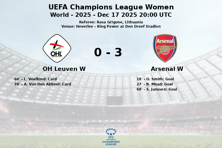 O. Smith a ouvert le score pour Arsenal W à la 18e minute avec un but bien négocié. B. Mead a élargi l’avance à la 27e minute, assistée par A. Russo. Malgré les tentatives de réaction d’OH Leuven W, Arsenal W a maintenu le contrôle du match. À la 69e minute, un but contre son camp de S. Janssen a scellé la victoire d’Arsenal W.
