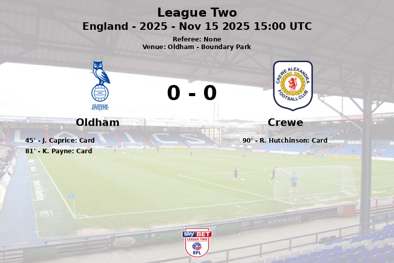 Le match a été caractérisé par un jeu physique, avec 17 fautes commises par Oldham et 6 par Crewe. L’arbitre a montré deux cartons jaunes aux joueurs d’Oldham, J. Caprice et K. Payne, et un à R. Hutchinson de Crewe. Malgré les efforts, les deux équipes sont reparties avec un point de cette rencontre de League Two.