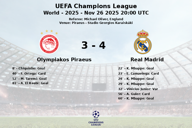 L’Olympiakos a frappé en premier avec un but de Chiquinho à la 8e minute, suite à une bonne passe décisive de A. El Kaabi. Cependant, le Real Madrid a réagi avec force, mené par un Kylian Mbappé spectaculaire. Le Français a égalisé à la 22e minute, servi par Vinicius Junior, puis a donné l’avantage à son équipe à la 24e minute grâce à une passe de A. Guler. Mbappé a complété son coup du chapeau à la 29e minute, servi par E. Camavinga, portant le score à 1-3. Un but de Vinicius Junior a été refusé par la VAR à la 32e minute pour hors-jeu, anéantissant la chance d’aggraver le score.