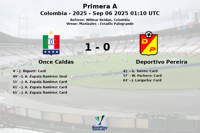 Once Caldas a dominé la possession avec 51 %, générant un total de 17 tirs, dont 6 ont été dirigés vers le but adverse. Deportivo Pereira, de son côté, a également généré 17 tirs, mais seulement 2 ont trouvé le filet. Le match s’est ouvert à la 49e minute avec un but de J. A. Zapata Ramirez pour Once Caldas. Cependant, la joie locale a été ternie par l’expulsion de Zapata Ramirez à la 61e minute après avoir reçu son deuxième carton jaune. Malgré avoir joué à 10 pendant près d’une demi-heure, Once Caldas a réussi à conserver son avance et à assurer la victoire. Le match s’est terminé avec un total de six cartons jaunes et un carton rouge, témoignant de la tension et de la dispute constante sur le terrain.
