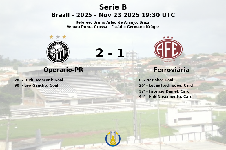 Ponta Grossa, Brésil – Dans un match disputé à l’Estádio Germano Krüger, Operário-PR et Ferroviária ont fait match nul dans une rencontre riche en émotions. Ferroviária a pris l’avantage dès la 8e minute avec un but de Netinho sur une passe d’Alencar. Malgré la domination de Operário-PR en termes de possession de balle (61%), l’équipe locale a eu du mal à concrétiser ses occasions. Ferroviária, quant à elle, a fait preuve d’une défense solide, bien qu’elle ait accumulé trois cartons jaunes (Lucas Rodrigues, Fabricio Daniel et Erik Nascimento). En seconde période, Operário-PR a intensifié son attaque et a réussi à égaliser à la 78e minute grâce à un but de Dudu Mosconi, sur une passe de Matheus Galdino. Alors qu’il semblait que Ferroviária allait remporter la victoire, Operário-PR a obtenu un penalty à la 90e minute, qui a été transformé par Leo Gaucho, scellant ainsi le match nul final. Le match s’est terminé avec une nette différence de possession (61% pour Operário-PR), bien que les deux équipes aient montré une intensité similaire en termes de nombre de fautes commises (17). Operário-PR a généré plus de tirs (14) et de corners (10) que Ferroviária, reflétant sa domination territoriale, mais son manque de précision était évident.
