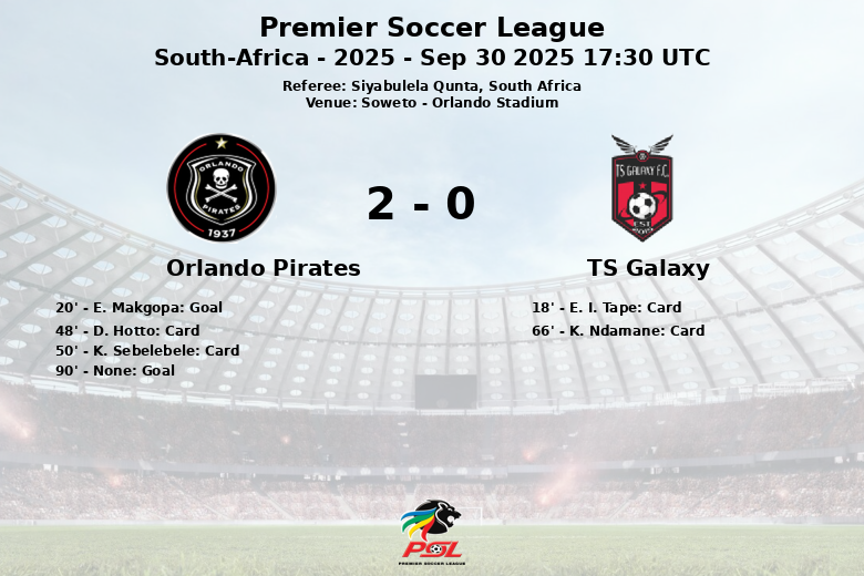 En seconde période, TS Galaxy a tenté de revenir au score, mais s’est heurté à une défense solide des Pirates. K. Ndamane a reçu un carton jaune pour TS Galaxy à la 66e minute. Orlando Pirates a scellé le match à la 90e minute avec un but qui a assuré la victoire.