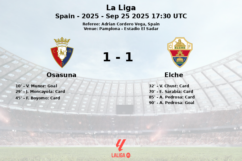Pampelune, le 25 septembre 2025 – L’Estadio El Sadar a été le théâtre d’un match disputé entre Osasuna et Elche, qui s’est terminé par un match nul 1-1. Un but rapide de V. Muñoz à la 10e minute, suite à une passe décisive d’A. Catena, a donné l’avantage à l’équipe locale. Cependant, Elche, avec une plus grande possession du ballon (61%), n’a pas abandonné et a cherché l’égalisation jusqu’à la fin.