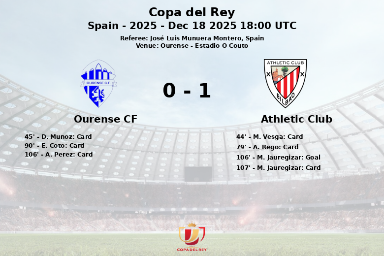 Le score est resté inchangé pendant les 90 minutes réglementaires, prolongeant le match en prolongation. L’impasse a été brisée à la 106e minute, lorsque M. Jauregizar, servi par A. Paredes, a marqué le seul but du match pour l’Athletic Club. Le match, marqué par un total de 34 fautes (22 pour Ourense et 12 pour l’Athletic), s’est terminé par la victoire de l’équipe de Bilbao, qui avance en Coupe du Roi.