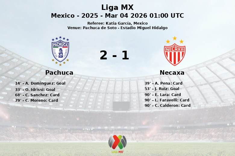 Pachuca de Soto, Mexique – Pachuca a battu Necaxa sur le score de 2 à 1 lors d’un match de la Liga MX Clausura 2025 (9ème journée), disputé à l’Estadio Miguel Hidalgo. Le match, arbitré par Katia García, s’est caractérisé par son intensité et le nombre élevé de cartons jaunes.