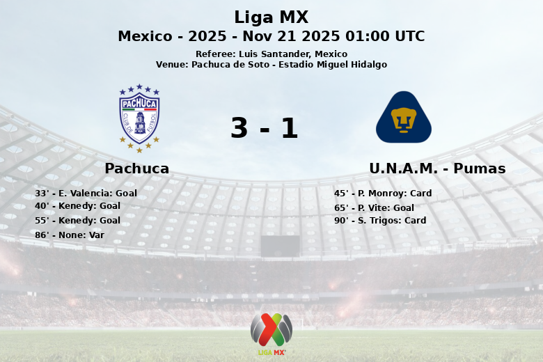 En deuxième mi-temps, Pachuca a continué à presser. Kenedy a marqué à nouveau à la 55e minute, grâce à une passe de O. Idrissi, consolidant la supériorité de l’équipe locale. Pumas a réussi à réduire le score à la 65e minute avec un but de P. Vite, assisté par J. Caicedo, mais la réaction féline n’a pas suffi à remettre sérieusement en question la victoire de Pachuca. Un but de Pachuca a été refusé pour hors-jeu après examen du VAR à la 86e minute.